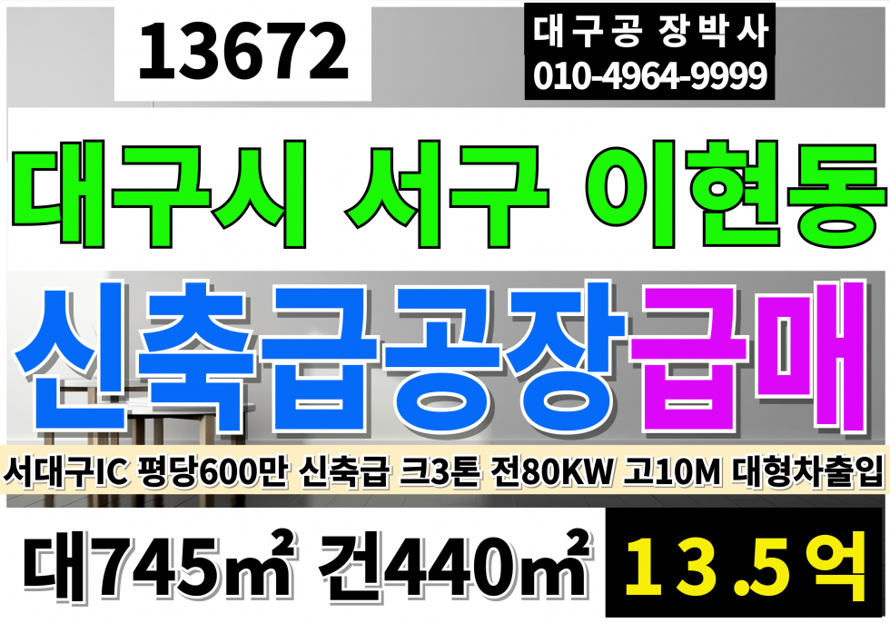 서대구공장창고 급매 매매 대225P 건133P 급매 13.5억 서대구IC  대구 서구 퀸스로드 신축급컨디션 호이스트3톤 동력80KW 층고10M