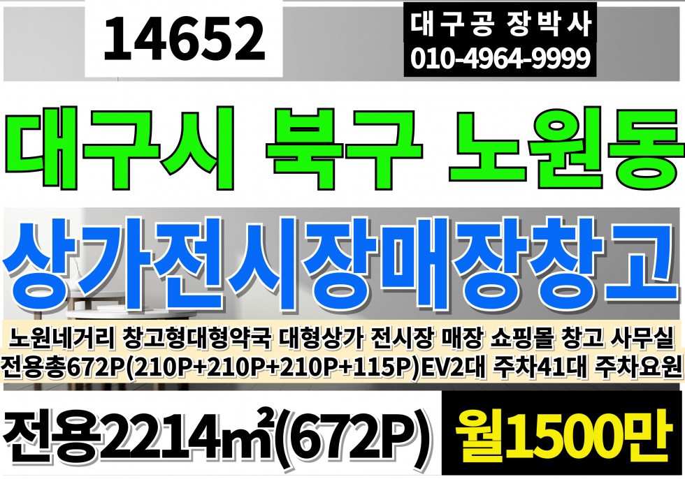 대구상가빌딩임대 대구 북구 노원동 전시장 도소매 매장 창고 쇼핑몰 사무실 물류 창고 EV2대 (장점:관리비일체없음)