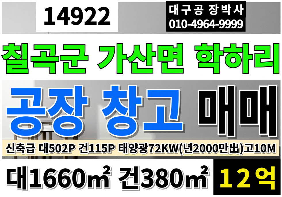 칠곡군공장매매 창고 급매 대502P 건115P 12억 경북 칠곡군 가산면 공장 창고 매매