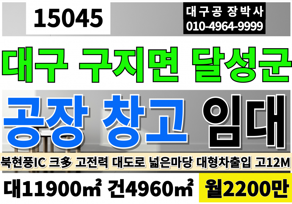 대구공장임대 창고 임대 대3600P 건1500P 월2200만 대구대형공장임대  호이스트다수 고전력 1층공장1067P